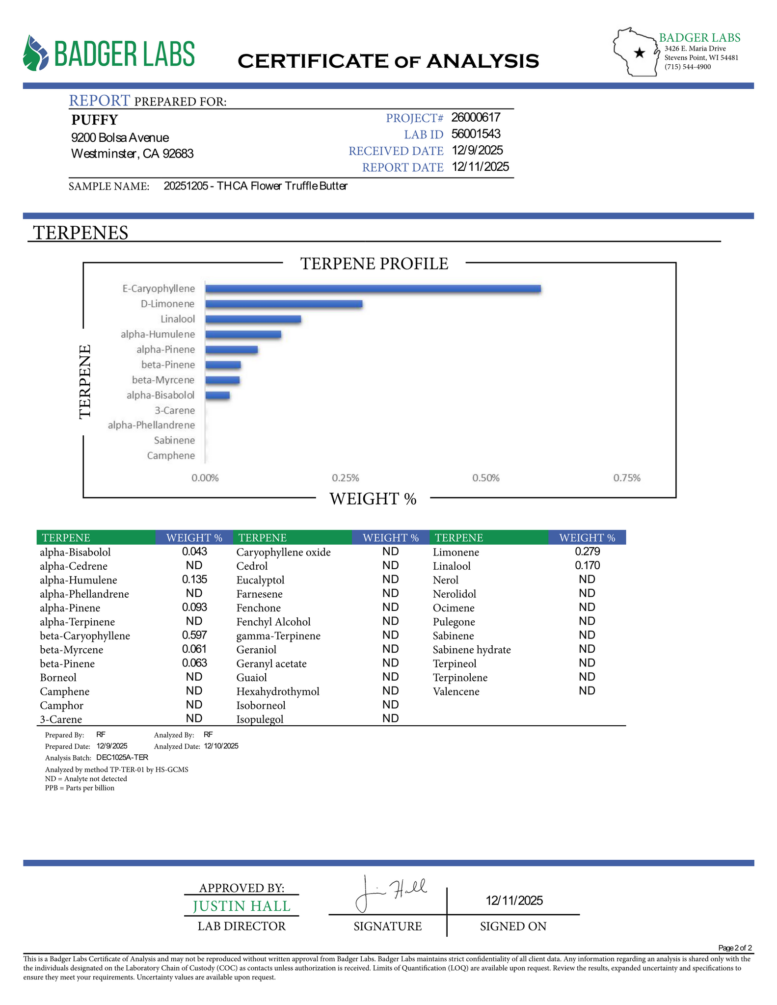 PUFFY Truffle Butter (smalls) is an Indica-dominant hybrid THCa strain, born from the flavorful cross of Gelato and Chocolate Kush. The aroma unfolds in a vibrant mix of fruity notes balanced by deep coffee richness and a gentle nutty twist. Visually, the buds are dense and striking, showcasing a deep forest-green base with vibrant purple hues, bright orange pistils, and a sparkling coating of trichomes. Consumers often report an initial burst of euphoria and uplifted mood, gradually giving way to deep physical relaxation, a sense of calm, and an increase in appetite.